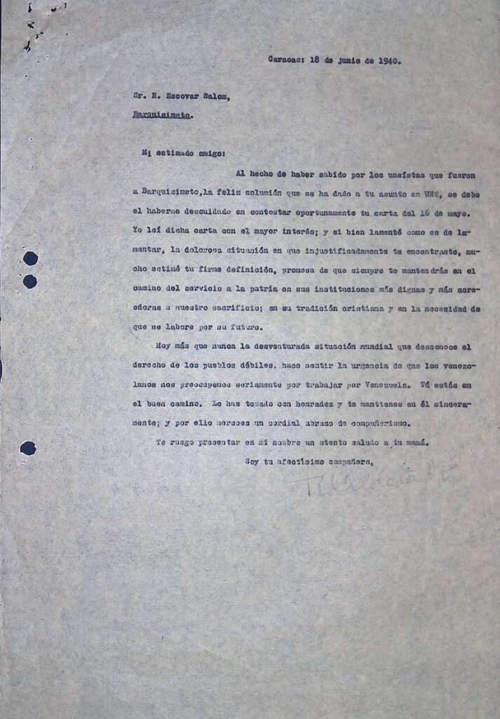 Al hecho de haber sabido por los uneístas que fueron a Barquisimeto, la feliz solución que se ha dado a tu asunto en UNE, se debe el haberme descuidado en contestar oportunamente tu carta del 16 de mayo. Yo leí dicha carta con el mayor interés; y si bien lamenté como se le lamentar, la dolorosa situación en que injustificadamente te encontraste, mucho atisfé tu firme definición, promesa de que siempre te mantendrás en el camino del servicio a la patria en sus instituciones más dignas y más acordes a nuestro sacrificio, en su tradición ordinaria y en la necesidad de que se labore por su futuro.