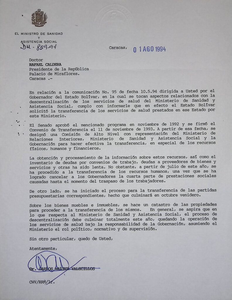 En relación a la comunicación No. 95 de fecha 10.5.94 dirigida a Usted por el Gobernador del Estado Bolívar, en la cual se tocan aspectos relacionados con la descentralización de los servicios de salud del Ministerio de Sanidad y Asistencia Social, cumplo con informarle que en efecto el Estado Bolívar solicitó la transferencia de los servicios de salud prestados en ese Estado por este Ministerio.