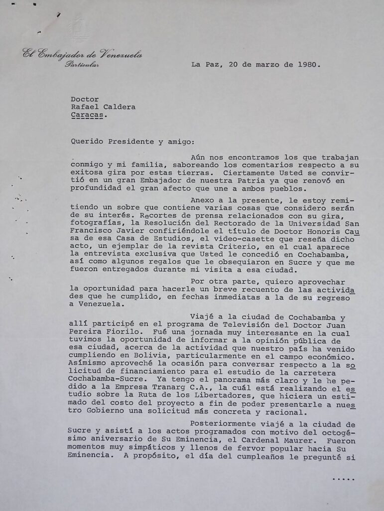 Anexo a la presente, le estoy remitiendo un sobre que contiene varias cosas que considero serán de su interés. Recortes de prensa relacionados con su gira, fotografías, la Resolución del Rectorado de la Universidad San Francisco Javier confiriéndole el título de Doctor Honoris Causa de esa Casa de Estudios, el video-cassette que reseña dicho acto, un ejemplar de la revista Criterio, en el cual aparece la entrevista exclusiva que Usted le concedió en Cochabamba, así como algunos regalos que le obsequiaron en Sucre y que me fueron entregados durante mi visita a esa ciudad.