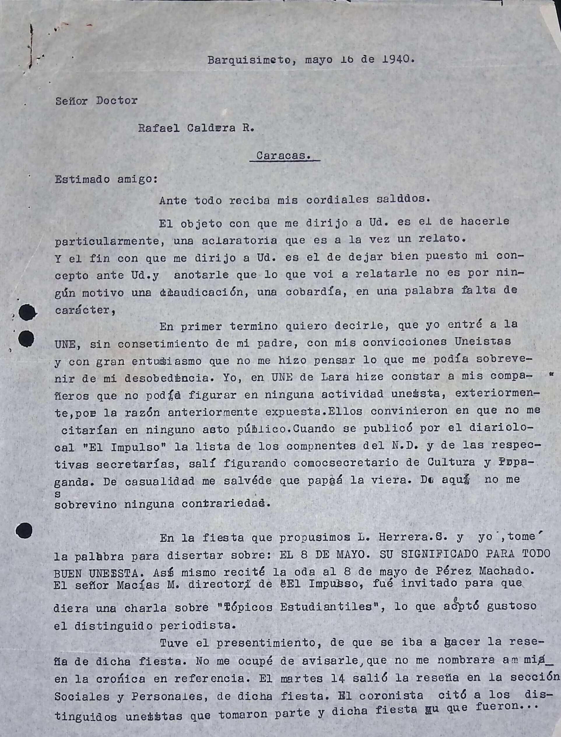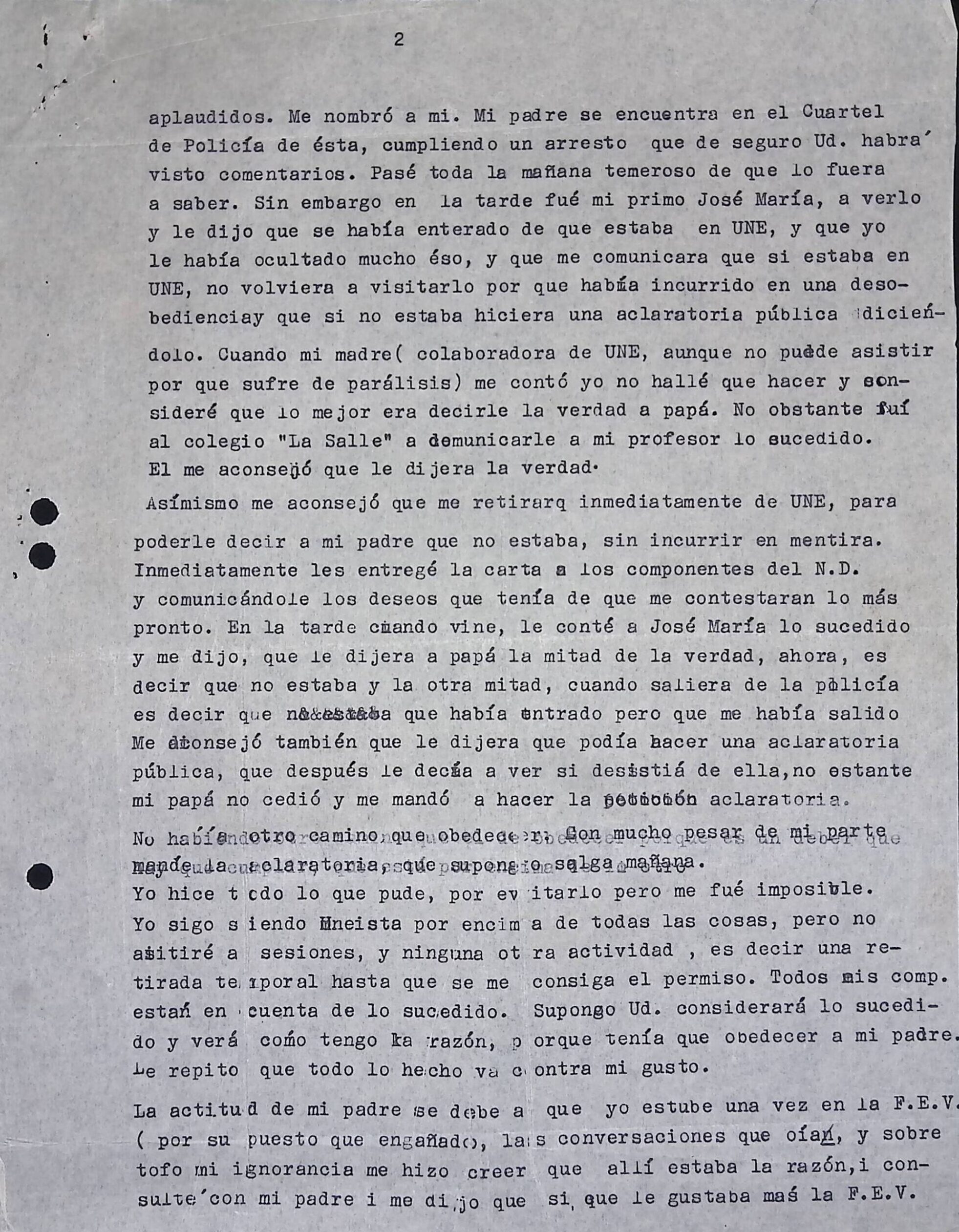 En primer termino quiero decirle, que yo entré a la UNE, sin consetimiento de mi padre, con mis convicciones Uneistas y con gran entudiasmo que no me hizo pensar lo que me podía sobrevenir de mi desobedincia. Yo, en UNE de Lara hize constar a mis compañeros que no podía figurar en ninguna actividad uneista, exteriormente, por la razón anteriormente expuesta. Ellos convinieron en que no me citarían en ninguna acto público. Cuando se publicó por el diario local «El Impulso» la lista de los compnentes del N. D. y de las respectivas secretarías, salí figurando como secretario de Cultura y Popaganda. De casualidad me salvé de que papaa la viera. De aquello no me sobrevino ninguna contrariedad.