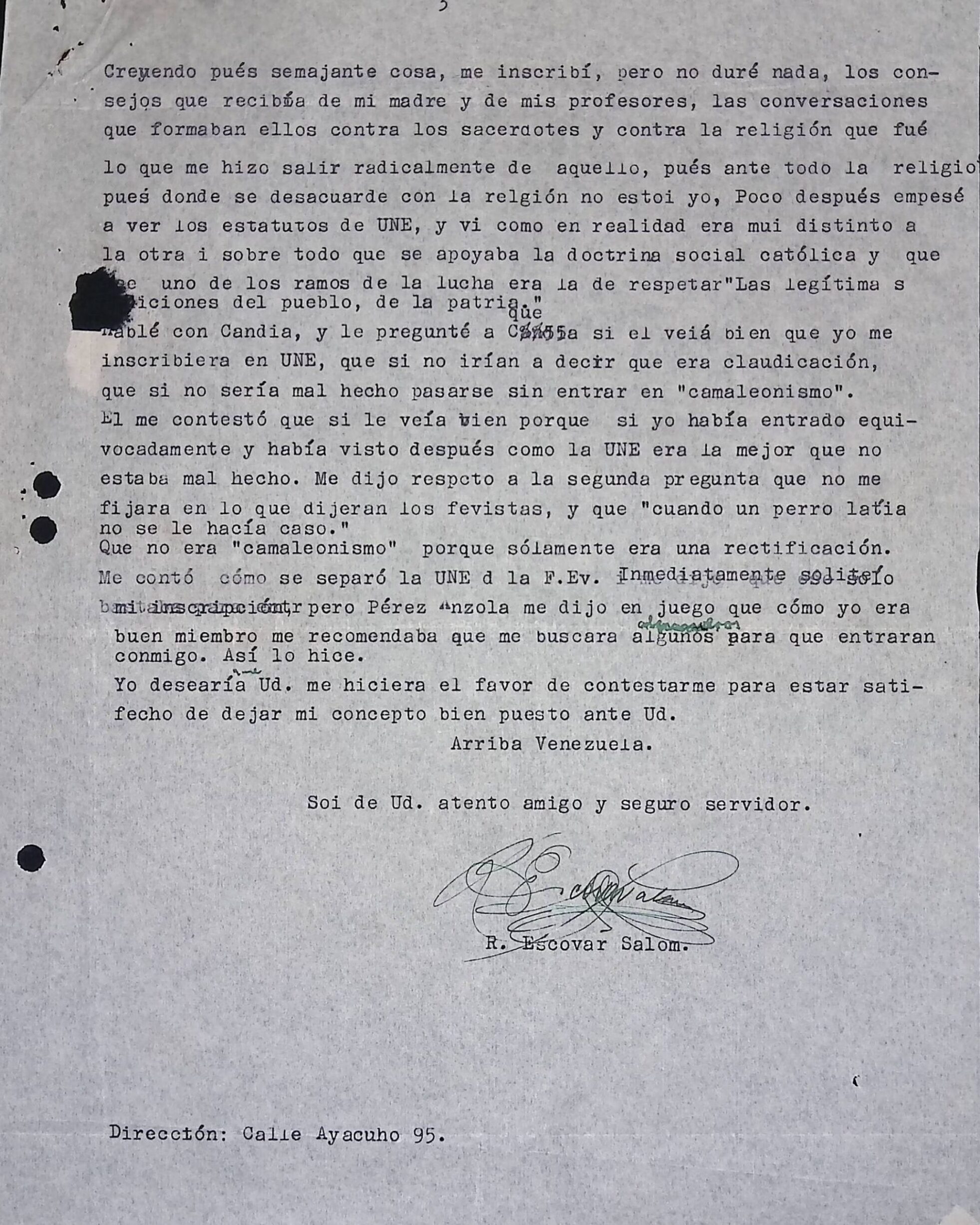 Creyendo pués semejante cosa, me inscribí, pero no duré nada, los consejos que recibía de mi madre y de mis profesores, las conversaciones que formaban ellos contra los sacerdotes y contra la religión que fué lo que me hizo salir radicalmente de aquello, pués ante todo la religio pues donde se desacuerde con la religión no estoi yo, Poco después empesé a ver los estatutos de UNE, y Vi como en realidad era mui distinto a la otra y sobre todo que se apoyaba la doctrina social católica y que uno de los ramos de la lucha era la de respetar «Las legitimas visiones del pueblo, de la patria». Hablé con Candia, y le pregunté a Cañosa si él veía bien que yo me inscribiera en UNE, que si no irían a decir que era claudicación, que si no sería mal hecho pasarse sin entrar en «camaleonismo».